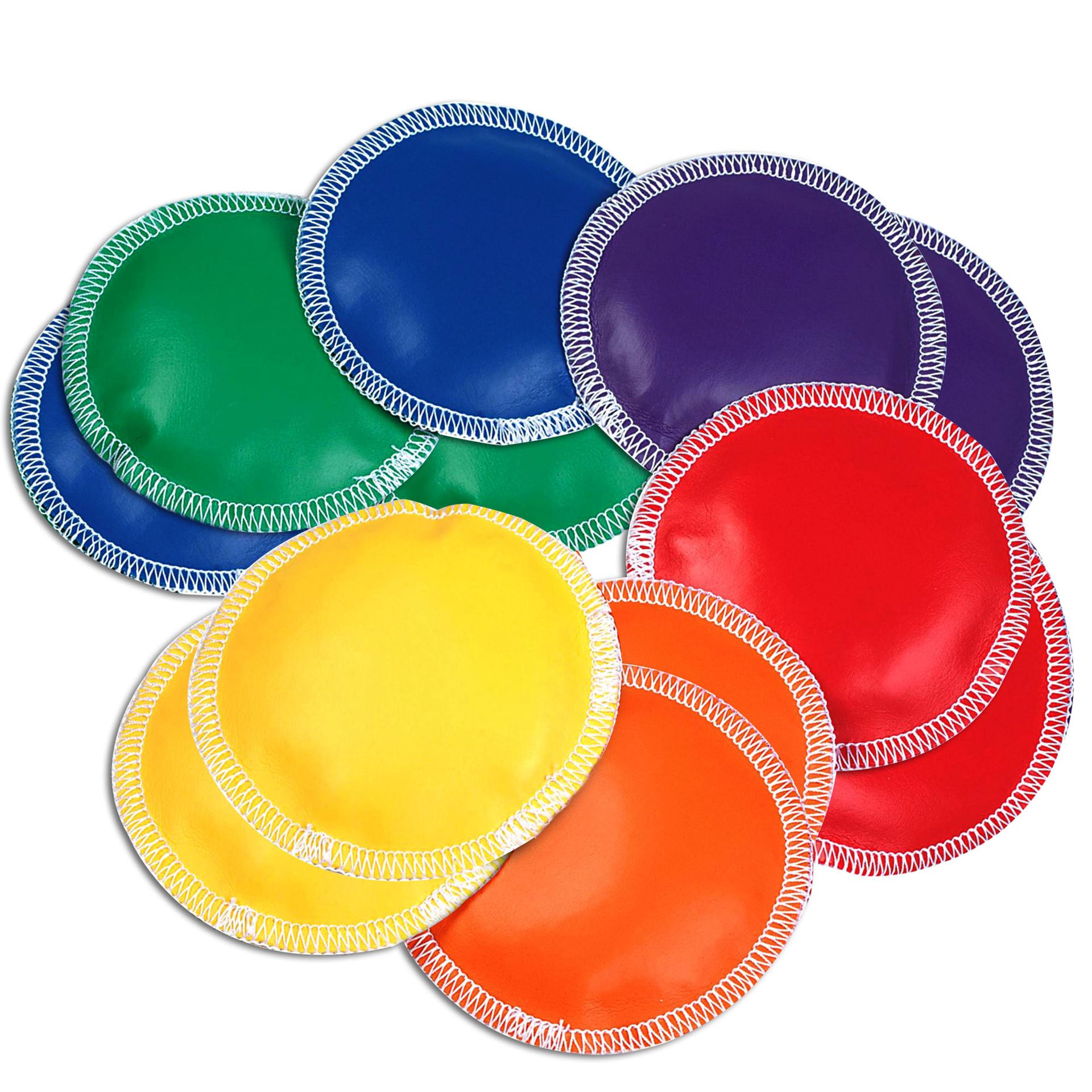 圆形沙包,六色,每色两个。边缘缝制紧密。表面PVC面料,清洁擦拭方便。可用于各种沙包游戏。
