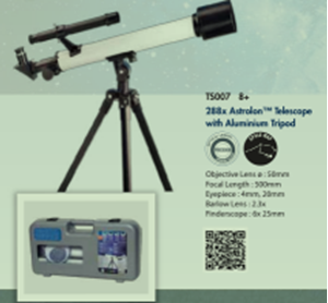 放大率288倍的望远镜,物镜镜片50MM,焦距500MM,目镜镜头支持直径4MM、20AMM;2.3倍巴洛镜,最大可以放大到662倍。带手提盒及铝合金支架。