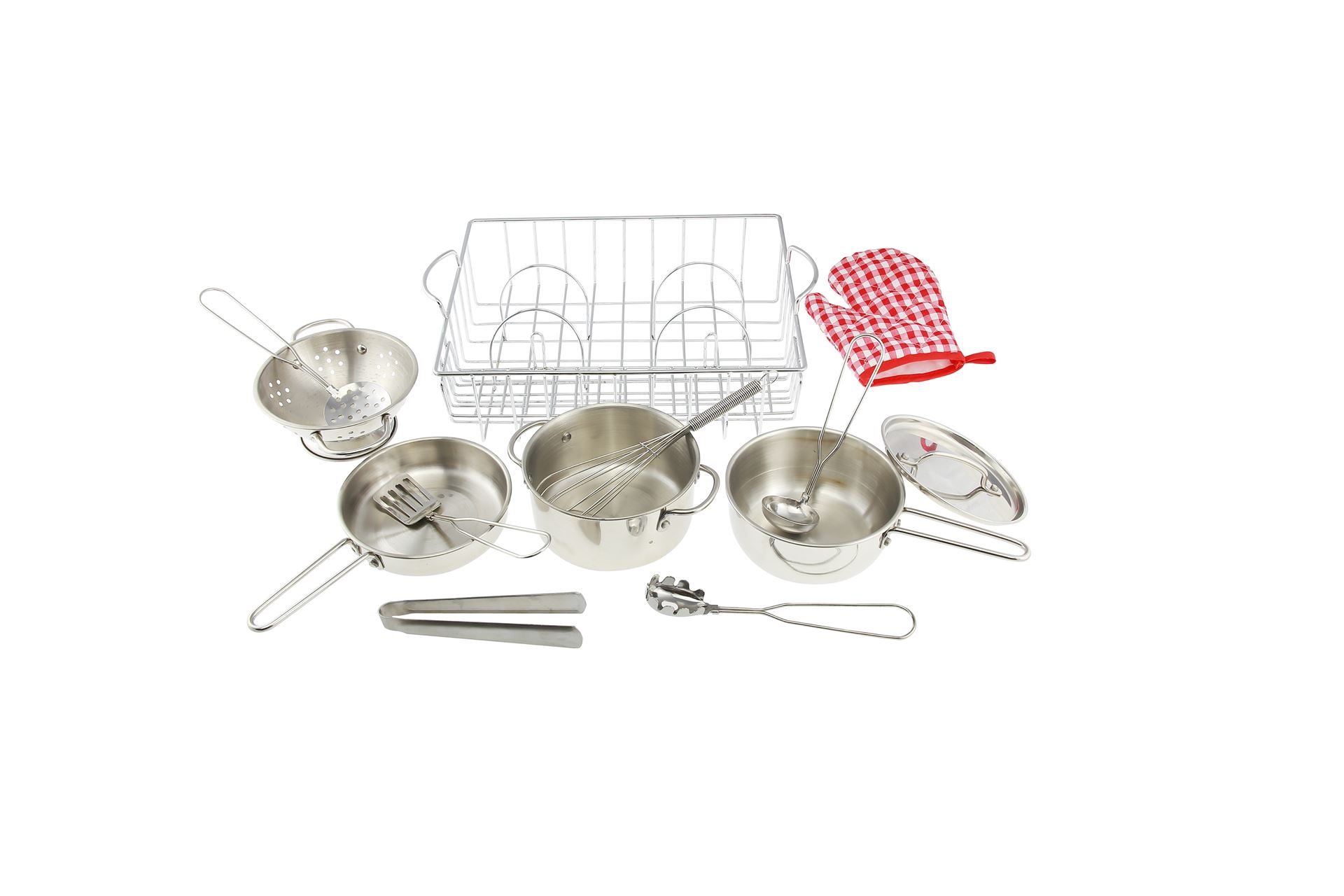 A 13 piece stainless steel pretend play cookware containing a pot, a pan, a lid, a stock pot, a colander, a ladle, a spatula, a skimmer, a spaghetti server, a whisk, an ice tong, a glove and a durable dish drainer. The set is made of thick stainless steel and hand polished for smooth surfaces. Designed and built for durability. Let our young chefs start their cooking now!