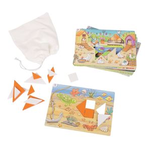 源自中国古老的七巧板游戏。游戏者观察彩卡并找到卡片边缘的数字,数字代表他需要用几个拼块完成这幅彩卡。如果少于7个他要找出他需要哪几个拼块来组成彩卡里的形状。