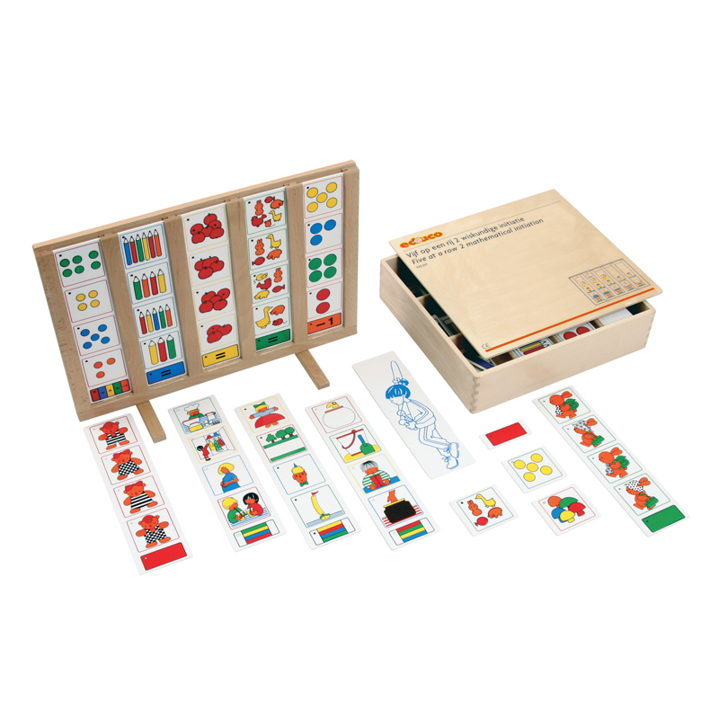 幼儿借助一个游戏木板架,把每个游戏的卡片按照符号和边框颜色排列,完成后,孩子们可以通过查看卡片背后的图案来自测是否正确。这款游戏可以简单、有效又有趣地介绍学前数学教育。