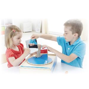 镜子工作室提供了23种游戏方式,引导孩子接触学习镜面实验,走进谁知反射和对称性现象的大门,帮助幼儿建立空间概念,获得日常生活常用的三维感知能力。孩子们能毫无困难地操作所有的实验,同时猜测实验结果并描述自己的预测。